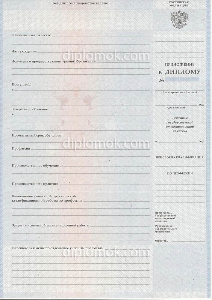 Цена диплома ПТУ данного образца составляет 18 000 руб. и включает в себя полный комплект (диплом, обложка, приложение), заполненный по Вашим требованиям, а также доставку по Москве, Санкт-Петербургу курьером или Почтой в другие регионы.