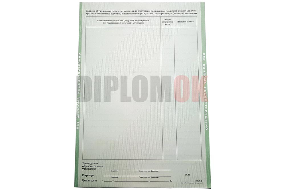 Диплом об окончании училища или лицея с 2011 по 2013 года включительно, заполненный нашими специалистами по государственным стандартам, заверенный подписями должностных лиц, а также печатью учебного заведения.